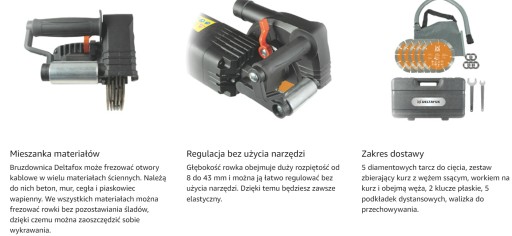 - Mieszanka materiałów: bruzdownica firmy DELTAFOX może frezować otwory na kable w wielu materiałach ściennych. Należą do nich beton, mur, cegła i cegła wapienno-piaskowa. We wszystkich materiałach można frezować rowki bez mostków, dzięki czemu można zaoszczędzić sobie wycinania.