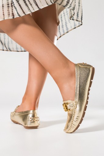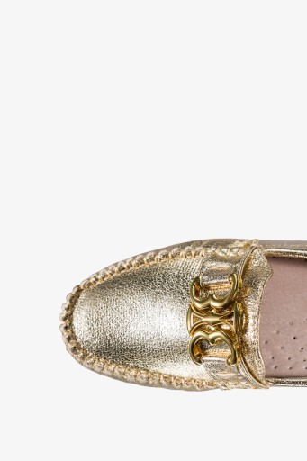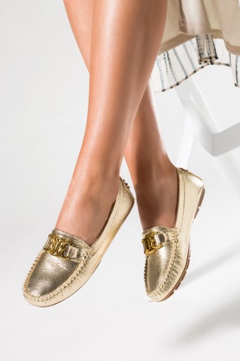 Złote mokasyny damskie model D24X3-G zostały wykonane z wysokogatunkowej skóry ekologicznej co gwarantuje doskonałą jakość, wygodę i dopasowanie do stopy. Przejdź do świata klasy i wyrafinowania z naszymi błyszczącymi mokasynami. To prawdziwe arcydzieło dla każdej kobiety ceniącej sobie eleganckie, a zarazem wygodne obuwie. Płaska podeszwa zapewnia komfort noszenia przez cały dzień. Bez względu na to, czy przemierzasz ulice miasta, czy spędzasz dzień w biurze, nasze mokasyny gwarantują maksymalny komfort. Płaska podeszwa minimalizuje obciążenie stawów, co czyni je idealnymi dla tych, którzy są w ciągłym ruchu. Obuwie wsuwane jest proste w zakładaniu i zdejmowaniu co sprawia, że są one doskonałym wyborem dla tych, którzy cenią sobie prostotę i funkcjonalność w jednym. Skórzana wkładka dopasowuje się do naszego kształtu stopy, tym samym zapewniając nam przyjemność z chodzenia. Złota ozdoba dodaje mokasynom niepowtarzalnego uroku, to wyrafinowany detal, który nadaje mu dodatkowej klasy i wyróżnia go na tle innych. Zaokrąglony czubek jest nie tylko modny, ale także zapewnia dodatkową przestrzeń dla palców, oferując pełen komfort podczas noszenia. Lekkość tych mokasynów gwarantuje, że czujesz się, jakbyś chodziła na chmurkach. Są doskonałym towarzyszem na długie dni pełne aktywności. Postaw na złoto i błysk z naszymi wyjątkowymi mokasynami.
