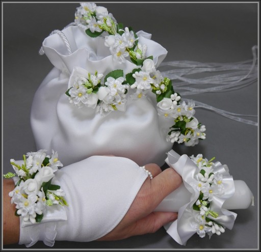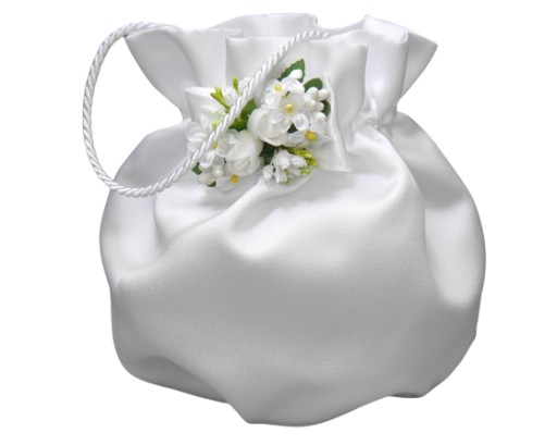Torebka satynowa z wkładką pomagającą w zachowaniu kształtu woreczka nawet po obciążeniu. Ozdobiona stroikiem z drobnymi kwiatkami. Woreczek został uszyty z pierwszego gatunku satyny ślubnej. Na pozostałych aukcjach można dopasować do niego np. profitkę na świecę komunijną, bransoletkę oraz wianek.
