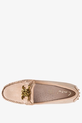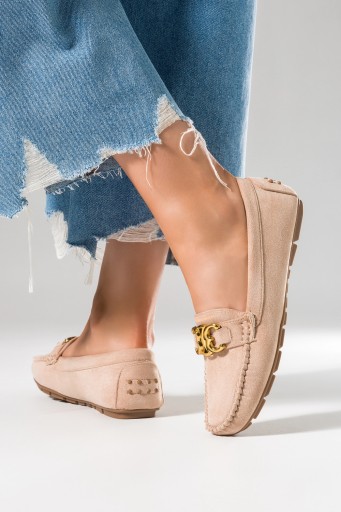 Beżowe mokasyny damskie model D24X3-BE zostały wykonane z wysokogatunkowego zamszu ekologicznego co gwarantuje doskonałą jakość, wygodę i dopasowanie do stopy. Przejdź do świata klasy i wyrafinowania z naszymi mokasynami. To prawdziwe arcydzieło dla każdej kobiety ceniącej sobie eleganckie, a zarazem wygodne obuwie. Płaska podeszwa zapewnia komfort noszenia przez cały dzień. Bez względu na to, czy przemierzasz ulice miasta, czy spędzasz dzień w biurze, nasze mokasyny gwarantują maksymalny komfort. Płaska podeszwa minimalizuje obciążenie stawów, co czyni je idealnymi dla tych, którzy są w ciągłym ruchu. Obuwie wsuwane jest proste w zakładaniu i zdejmowaniu co sprawia, że są one doskonałym wyborem dla tych, którzy cenią sobie prostotę i funkcjonalność w jednym. Skórzana wkładka dopasowuje się do naszego kształtu stopy, tym samym zapewniając nam przyjemność z chodzenia. Złota ozdoba dodaje mokasynom niepowtarzalnego uroku, to wyrafinowany detal, który nadaje mu dodatkowej klasy i wyróżnia go na tle innych. Zaokrąglony czubek jest nie tylko modny, ale także zapewnia dodatkową przestrzeń dla palców, oferując pełen komfort podczas noszenia. Lekkość tych mokasynów gwarantuje, że czujesz się, jakbyś chodziła na chmurkach. Są doskonałym towarzyszem na długie dni pełne aktywności. Postaw na błysk z naszymi wyjątkowymi mokasynami.