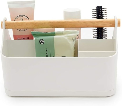 ① – Organizer przyborów do makijażu – organizer łazienkowy – biały②INTELIGENTNY DESIGN: Praktyczny i stylowy organizer do łazienki lub sypialni zapewniający porządek w kosmetykach i akcesoriach kosmetycznych.③OSZCZ?DNO?? MIEJSCA: Ten wielofunkcyjny przybornik ma 7 przegródek pozwalających zoptymalizowa? miejsce do przechowywania kosmetyków do makijażu, szczotek do włosów czy produktów do pielęgnacji skóry, na widoku lub schludnie w szafkach.④TRWA?O?? I WYTRZYMA?O??: Wykonany z mocnego tworzywa ABS, aby chroni? Twoje produkty, ze stylową drewnianą rączką ułatwiającą przenoszenie i antypoślizgowymi podkładkami podnoszącymi stabilnoś?. Podstawę organizera można łatwo zdją?, by przybornik opróżni? i wyczyści?.⑤UNIWERSALNO??: Duże przegródki pomieszczą flakony perfum czy środki czyszczące, natomiast mniejsze idealnie nadają się do uporządkowania balsamów do ust, lakierów do paznokci lub pęset. Organizer sprawdzi się także na biurku, na przybory papiernicze.