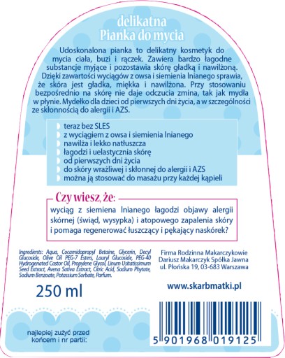 Udoskonalona pianka to delikatny kosmetyk do mycia ciała, buzi i rączek. Zawiera bardzo łagodne substancje myjące i pozostawia skórę gładką i nawilżoną. Dzięki zawartości wyciągów z owsa i siemienia lnianego sprawia, że skóra jest gładka, miękka i nawilżona. Przy stosowaniu bezpośrednio na skórę nie daje odczucia zimna, tak jak mydła w płynie.