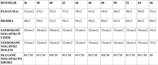 TABELA PRZEDSTAWIA WYMIARY SPODNI NA PŁASKO
