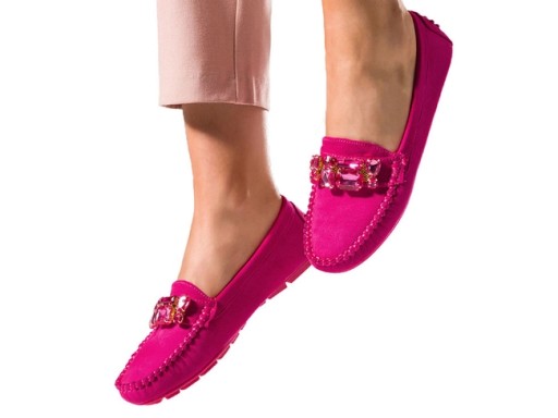 MOKASYNY PÓŁBUTY DAMSKIE PŁASKIE WSUWANE OZDOBNE KRYSZTAŁKI FUKSJOWE