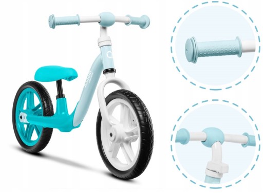 Pozwala trenować utrzymywanie równowagi, koordynację ruchową oraz wzmacniać mięśnie Dziecko może doskonalić swoją orientację w terenie Rowerek gwarantuje godziny wspaniałej zabawy na świeżym powietrzu pozwalając dziecku odkrywać świat wokół niego Regulacja wysokości siodełka i kierownicy sprawia, że rowerek będzie użyteczny przez długi czas Bezobsługowe koła PU 12" Rowerek został wyposażony w 12-calowe koła wykonane z zaawansowanej technologicznie pianki EVA Koła są nieprzebijalne dzięki czemu sprawdzą się na każdej nawierzchni Są bezobsługowe - nie ma konieczności pompowania Bieżnik poprawia przyczepność podczas jazdy oraz znacznie redukuje wagę rowerka względem pojazdów z pompowanymi kołami Gwarancja komfortu