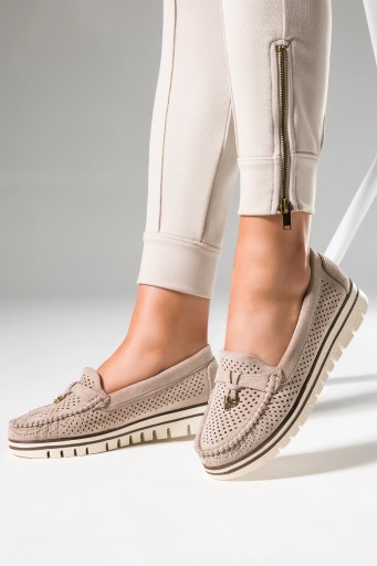 Beżowe mokasyny damskie model D24X5-BE zostały wykonane z wysokogatunkowego zamszu ekologicznego co gwarantuje doskonałą jakość i dopasowanie do stopy. Odkryj elegancję dzięki najnowszej kolekcji ażurowych mokasynów. Te wyjątkowe wsuwane buty, są idealnym rozwiązaniem dla kobiet ceniących sobie szykowny design i niezrównaną wygodę. Wzór, który proponujemy, zostały starannie zaprojektowane z myślą o wielbicielkach klasyki z nutką nowoczesności. Dzięki zaokrąglonemu czubkowi, te mokasyny doskonale komponują się z każdym rodzajem stopy, zapewniając optymalne dopasowanie. Ażurowy wzór nie tylko dodaje butom lekkości i świeżości, ale także umożliwia stopie oddychanie, co jest szczególnie ważne w cieplejsze dni. Delikatna ozdoba na cholewce subtelnie podkreśla ich unikatowy charakter, nie przytłaczając jednocześnie całościowej estetyki buta. Solidna bieżnikowana platforma gwarantuje przyczepność i stabilność na różnych powierzchniach, zapewniając bezpieczeństwo kroku w miejskim zgiełku. Jest to idealna propozycja dla aktywnych kobiet, które cenią sobie dynamikę życia, ale nie chcą rezygnować z eleganckiego wyglądu. Wkładka wykonana ze skóry zapewnia komfort nawet podczas całodniowego użytkowania. Dzięki temu Twoje stopy mogą doświadczyć uczucia miękkości i luksusu, które trudno porównać z innymi materiałami. Wybierając beżowe mokasyny ażurowe, inwestujesz w buty, które łączą w sobie piękno i funkcjonalność. Zadbaj o swoją garderobę i dodaj jej stylowego charakteru z tymi wyjątkowymi mokasynami. Czy to klasyczny dzień w pracy, spontaniczne wyjście z przyjaciółmi, czy relaksujący spacer po mieście – te buty będą Twoim niezawodnym partnerem.