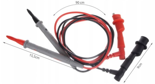 - DŁUGI KABEL – długość całkowita, jaką mają przewody do miernika to aż 107 cm, a długość, jaką mają same kable pomiarowe bez końcówek to aż 90 cm. Pozwala to na bezproblemowe dotarcie w każde miejsce.