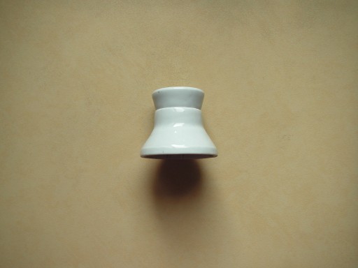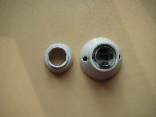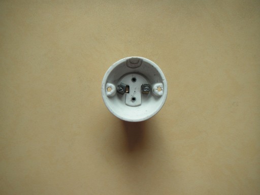 Oprawa porcelitowa 220 V na żarówkę z gwintem E 27. Przystosowana do żarówek o mocy 100 W. Średnica podstawy 7 cm, wysokość 6 cm. Lata 50-te ubiegłego stulecia.