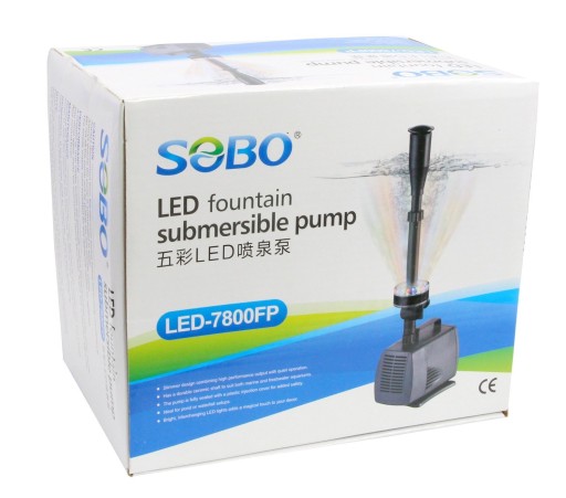 Pompy marki SOBO przeznaczone do całkowitego zanurzenia charakteryzują się wysoką wydajnością oraz podnoszeniem słupa wody. Pompy te tworzą rewelacyjny efekt dekoracyjny oczka wodnego oraz nadają się też do zastosowania w systemach filtracyjnych (filtry ciśnieniowe i przelewowe, lampy UV). Mogą być także stosowane do zasilania kaskad ale podstawowa ich funkcja to fontanna. Pompa posiada teleskopową rurkę, dzięki której można łatwo dostosować wysokość do poziomu wody oraz trójnik z bocznym, dodatkowym wyjściem, np. na kaskadę wraz z zaworem do łatwej regulacji przypływu wody. W zestawie są 2 rożne dysze fontannowe oraz ring świetlny RGB, czyli świecący w kolorach: czerwonym, zielonym i niebieskim w rożnych kombinacjach i w automatycznym programie.