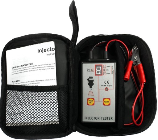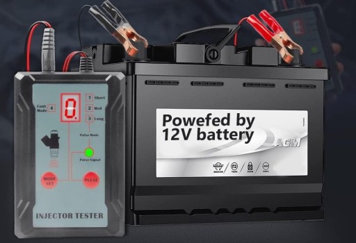 Tester wykrywa usterki w układzie wtryskiwaczy samochodu z akumulatorem 12 V za pomocą indywidualnego testu poszczególnych wtryskiwaczy.