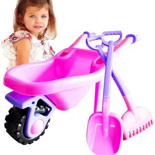 DUŻY ZESTAW DLA DZIEWCZYNKI - DUŻA I SOLIDNIE WYKONANA TACZKA DO PIASKU + ŚWIETNA DUŻA KOSIARKA DLA MAŁEJ OGRODNICZKI + DUŻA ŁOPATA I GRABIE