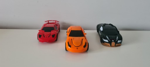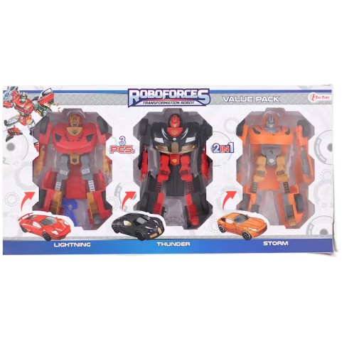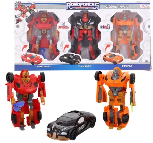 Zestaw trzech super robotów transformujących się w auta to idealna zabawka dla wszystkich dzieci! Użyj specjalnej zdolności, by pokonać wroga, i zamień się w kilka sekund z robota bojowego w superszybkie auto sportowe.