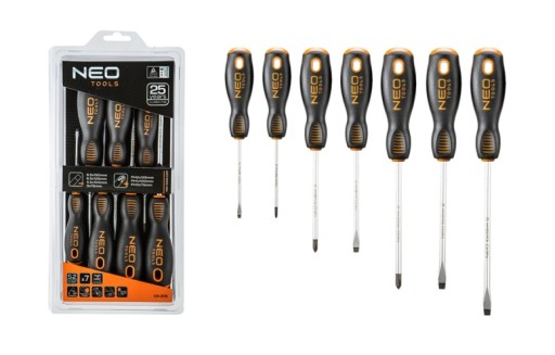 Zestaw wkrętaków NEO (nr ref. 04-206) zawiera 7 wkrętaków: płaskie i krzyżowe. Grot wkrętaka wykonany jest z wyjątkowo wytrzymałej stali S2. Końcówka robocza grota została poddana obróbce cieplnej, dzięki czemu uzyskano odpowiednią twardość i odporność na zgięcia. Wkrętak posiada magnetyczną końcówkę. Trójgraniasty kształt uchwytu z wyprofilowanym oparciem dla kciuka zmniejsza obciążenie dłoni podczas pracy i ułatwia uzyskanie optymalnego momentu obrotowego. Uchwyt dwumateriałowy zapobiega ślizganiu się w dłoni, odporny jest na działanie chemikaliów, olejów i smarów. Jakość narzędzia potwierdzona 25-letnią gwarancją producenta. Marka NEO spełnia oczekiwania profesjonalistów.