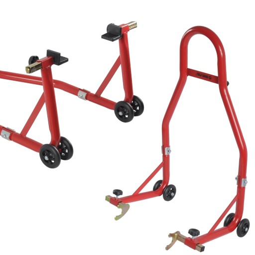 ✔️ Uniwersalny stojak do motocykli pasuje do większości motorów dostępnych na rynku. Podnośnik wyposażony został w koła jezdne co umożliwia łatwy transport. Wykonany został z mocnego metalu. Stojak bez problemy poradzi sobie z utrzymaniem motocykla. W zestawie znajdują się 2 adaptery możliwość montażu na przód bądź tył w zależności od potrzeby użytkownika. Zestaw składa się dwóch stojaków.