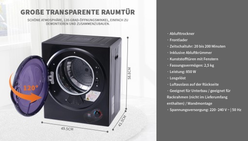 Minisuszarka bębnowa, 2,5 kg, do montażu na ścianie, łatwa w obsłudze, timer 200-minutowy, podwójny filtr, ogrzewanie ceramiczne PTC, cylinder ze stali nierdzewnej, zabezpieczenie przed przegrzaniem, odpowiednia temperatura suszenia 65°C