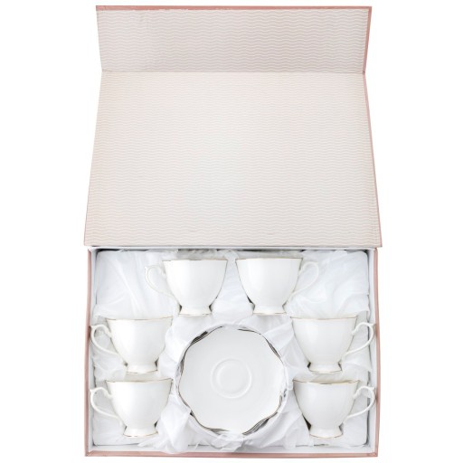 Filiżanki ze spodkiem Liric uwodzą połączeniem białej elegancji i złotego luksusu. Malowane złotem wykończenia znajdziesz na brzegach filiżanek i spodów. W zestawie jest ich po sześć (12 elementów). Korzystanie z tych lekkich i delikatnych naczyń to czysta przyjemność. Tym bardziej, że wysokiej jakości porcelana New Bone China gwarantuje nieskazitelne powierzchnie miłe w dotyku. Pojemność każdej z filiżanek to 220 ml, a średnica spodka to 15 cm. Nie nadają się one do zmywarki i mikrofalówki. Stylowe pudełko prezentowe kusi, by uczynić z tego kompletu prezent na wyjątkową okazję.