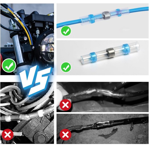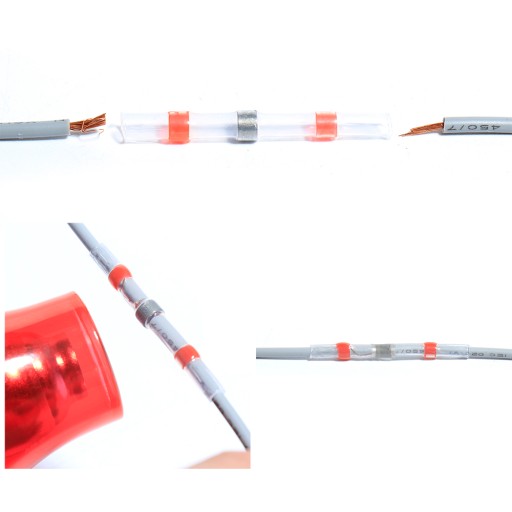 Zestaw szybkozłączek z cyną w rurze termokurczliwej do naprawy i podłączenia przewodu.