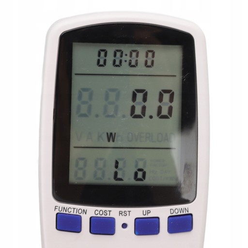 3. Funkcje i parametry: Amperomierz z alarmem przeciążenia, alarmem zużycia energii, alarmem kosztów, wskazaniem światła LED itp. Z parametrami takimi jak moc (W), energia (kWh), napięcie, natężenie, współczynnik mocy, koszt, minimum i maksymalna moc