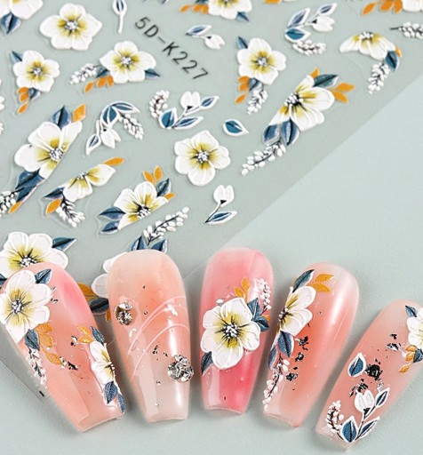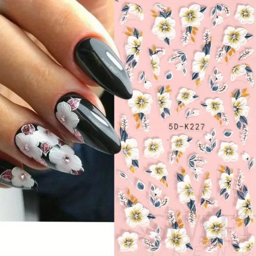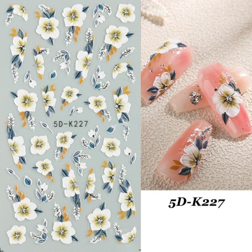 NAKLEJKI NA PAZNOKCIE SAMOPRZYLEPNE BIAŁO ŻÓŁTE 5D MALOWANE KWIATY 5D-K227
