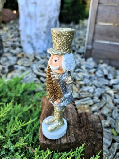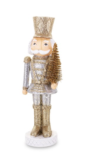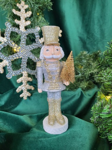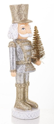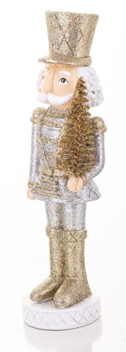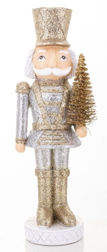 Dziadek do orzechów na kwadratowym podeście z choinką w stylu bajkowym, w kolorze srebra i złota. Figurka dziadka do orzechów, będzie doskonałym pomysłem na prezent, ustawiona na konsoli lub pod choinką nada wnętrzu bajkowego świątecznego klimatu. Dziadek do orzechów to symbol bożonarodzeniowych cudownych przemian i nieskończonej odnowy życia.