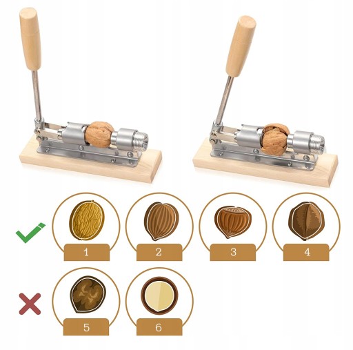 Wygodny i solidny dziadek do orzechów. Wykonany ze stali nierdzewnej, przymocowany do grubej drewnianej podstawki zapobiegającej jego przesuwaniu. Jego obsługa jest niezwykle łatwa i bezpieczna a do łupania orzechów nie trzeba używać dużo siły.