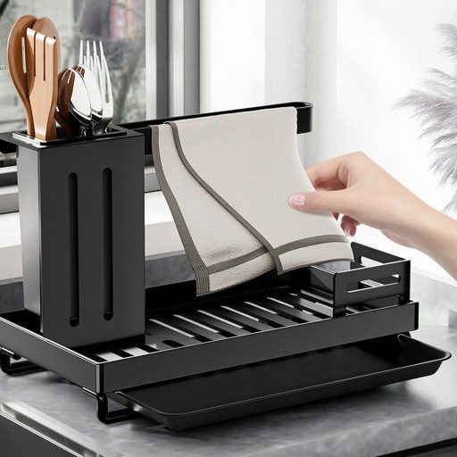 [Sortowanie i przechowywanie]: 2-poziomowy stojak na przyprawy kuchenne można sortować i przechowywać. Górna warstwa służy do wieszania szmat, a dolna do łapania tacek z wodą, oszczędzając miejsce i zapewniając schludne otoczenie.