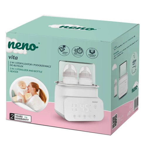 Neno Vita jest wyposażony w funkcję sterylizacji, która zapewnia utrzymanie czystości i higieny butelek, gryzaków oraz smoczków. Użyj dedykowanego koszyczka dołączonego do zestawu, aby wygodnie i bezpiecznie wyciągnąć przedmioty po sterylizacji i uniknąć oparzenia. Urządzenie posiada funkcję podgrzewania mleka, dzięki której możesz szybko i sprawnie podgrzać pokarm dla swojej pociechy. Wystarczy wybrać odpowiednią temperaturę i włączyć podgrzewanie