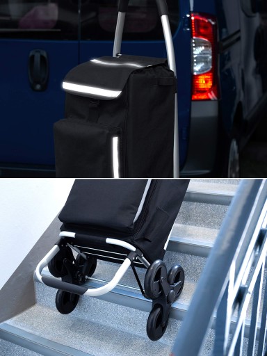 - Urządzenie do wspinania się po schodach: system 3 + 3 kół umożliwiający łatwe wchodzenie po schodach, nawet przy pełnym obciążeniu. Łatwe pokonywanie wysokich krawężników. Łatwe wejście do autobusu i pociągu. Idealny do transportu zakupów na wyższe piętra
