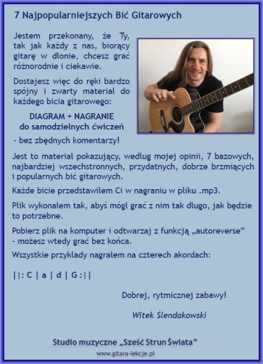 - Moje autorskie, oparte na doświadczeniu w nauczaniu gry na gitarze w moim Studio muzycznym "Sześć Strun Świata" - zestawienie "7 najpopularniejszych bić gitarowych"