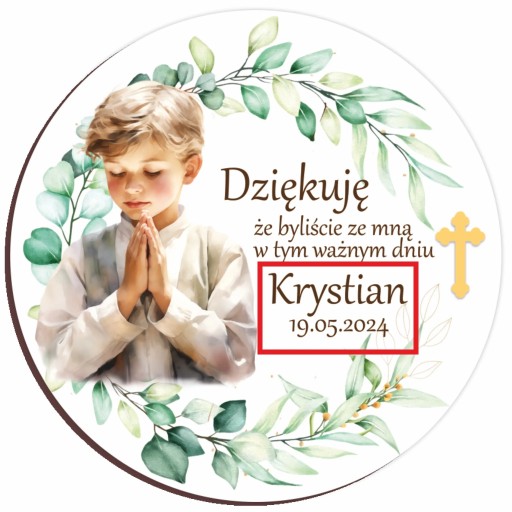 Ten uroczy personalizowany magnes z nadrukiem stanowi wyjątkowe podziękowanie dla gości za ich udział w uroczystości Komunii Świętej. Dzięki niemu można wyrazić wdzięczność w uroczysty i praktyczny sposób.