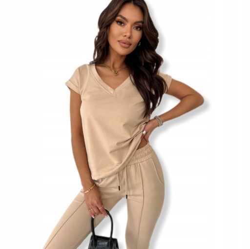 Komplet składający się z bluzki z krótkim rękawem i dekoltem w literę V oraz spodni o jednolitej kolorystyce. Bez wątpienia świetnie sprawdzi się w wielu codziennych stylizacjach. Kieszonki oraz gumka w pasie podkreślają sportowy charakter zestawu, natomiast przyjemny, lekki materiał sprawia, że jest on niezwykle wygodny i świetnie się nosi. To świetna propozycja na co dzień, na spotkanie ze znajomymi czy wiosenne wyjście na miasto.
