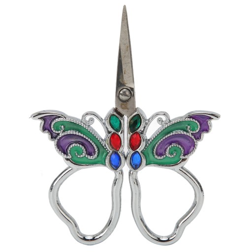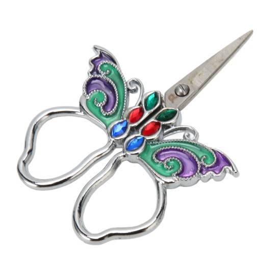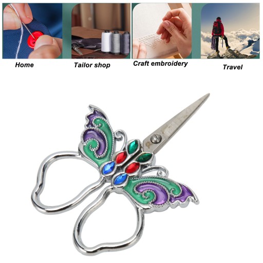 2. Wygląd motyla: Vintage nożyczki do szycia mają wyjątkowy i piękny wygląd motyla z kombinacją srebrnego i fioletowo-zielonego koloru.