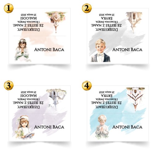 Z tyłu winietki podziękowanie z imieniem dziecka i datą komunii.