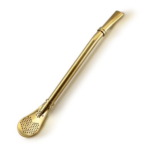 Tradycyjna Bombilla (słomka) – ZŁOTA od Yerbador Bombilla yerba mate Yerbador, w której dolny koniec jest perforowany, działa jak metalowy filtr, który służy do oddzielania naparu mate od liści, łodyg i innych resztek mate i działa w podobny sposób, jak perforowane metalowe sitko w czajniczku.