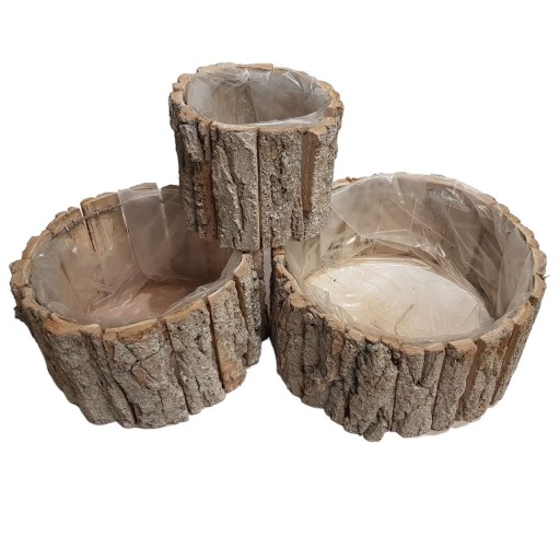 Komplet stanowi 3 sztuki doniczek drewnianych o wymiarach podanych powyżej o wyglądzie jak na zdjęciu obok