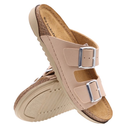 Klapki damskie renomowanej marki Inblu zostały wykonane z zewnątrz ze skóry ekologicznej. Miękka wkładka ze skóry naturalnej zapewnia odpowiedni komfort dla stóp. Regulowane paski na klamrę umożliwiają dopasowanie modelu do stopy.