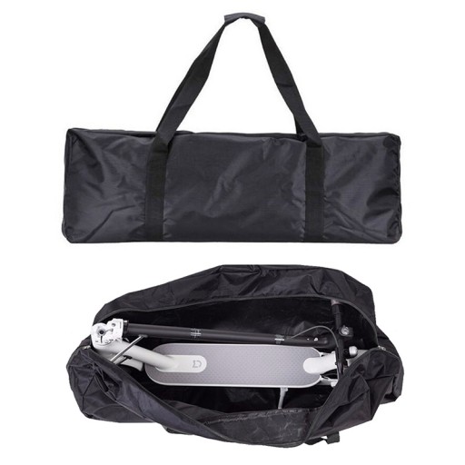 Wytrzymała, zamykana na zamek, wykonana z wodoodpornego materiału torba do przenoszenia i przechowywania hulajnogi elektrycznej. Torba po złożeniu zajmuje mało miejsca i można ją zamocować np. do hulajnogi.