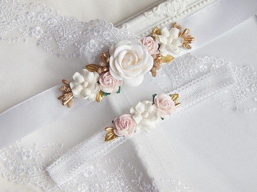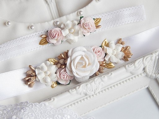 Różany pasek do sukienki wykonany z wstążki satynowej w kolorze białym o długości ok 120cm. zdobiony pięknymi kwiatami.