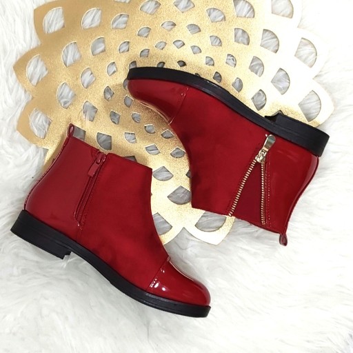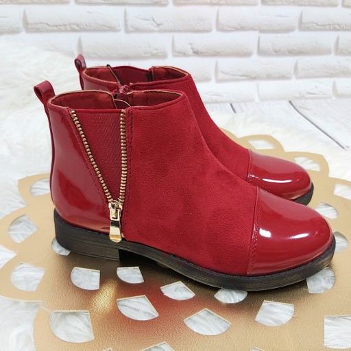 Urocze botki dziewczęce w pięknym głębokim odcieniu czerwieni. Zapięcie na suwak. Lakierowany nosek i tylna część buta zabezpieczają przed wilgocią. Lekko ocieplane idealne na przejściowe pory roku.