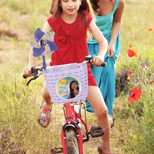 Piękny koszyczek na kierownicę jest wykonany z kolorowego tworzywa sztucznego i ozdobiony naklejką z ulubionymi postaciami z bajek Disney.