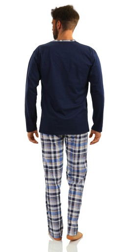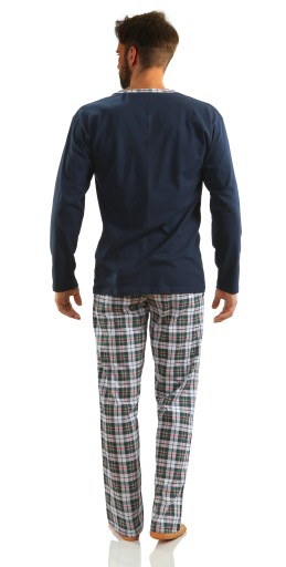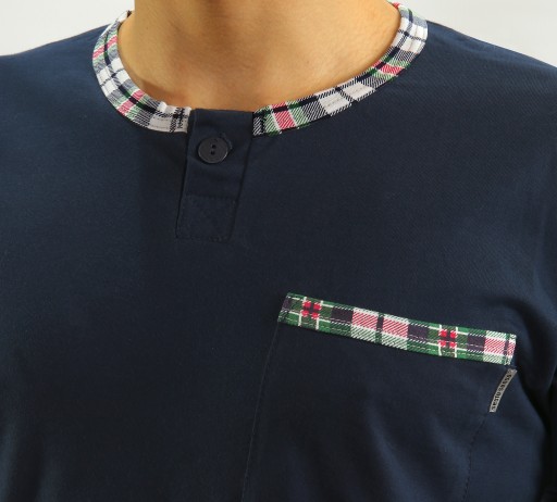 Piżama męska Jasiek z długim rękawem rękawem wykonana jest z wysokiej jakości bawełny. Składa się koszulki - dekolt, zapięcie oraz ozdobna kieszonka wykończone lamówką, oraz spodni w kratę typu Madras.Występuje w trzech wersjach kolorystycznych
