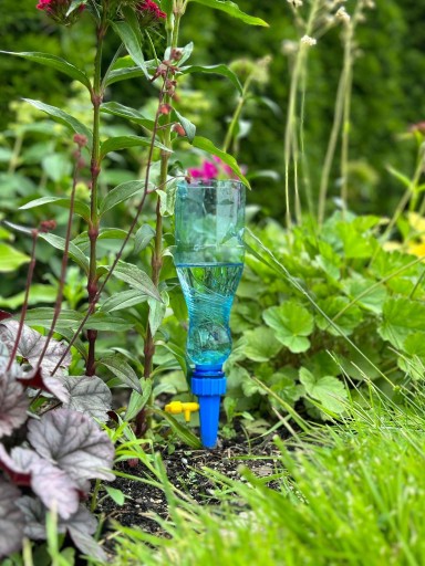 - Umieść butelkę z nawadniaczem w doniczce. Postaraj się umieścić go stabilnie, tak aby nie przewrócił się.