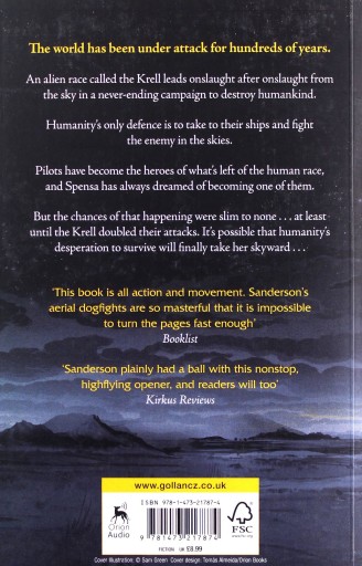 Spensa's world has been under attack for hundreds of years. An alien race called the Krell leads onslaught after onslaught from the sky in a never-ending campaign to destroy humankind. Humanity's only defense is to take to their ships and fight the enemy in the skies. Pilots have become the heroes of what's left of the human race. Spensa has always dreamed of being one of them; of soaring above Earth and proving her bravery. But her fate is intertwined with her father's - a pilot who was killed years ago when he abruptly deserted his team, placing Spensa's chances of attending flight school somewhere between slim and none. No one will let Spensa forget what her father did, but she is still determined to fly. And the Krell just made that a possibility. They've doubled their fleet, making Spensa's world twice as dangerous . . . but their desperation to survive might just take her skyward . . .