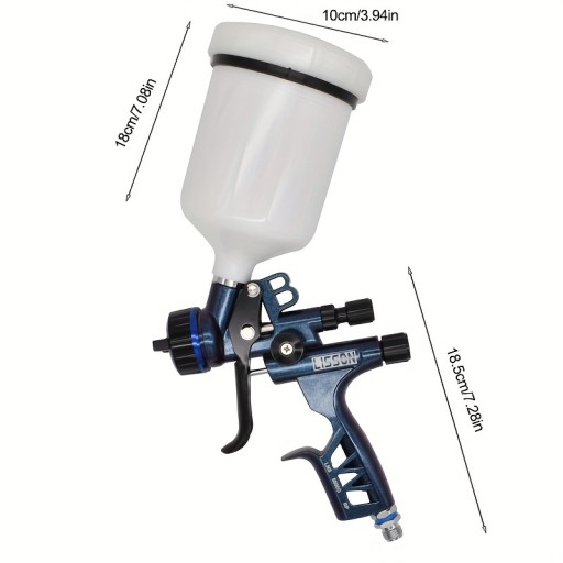 【Specification】Standard Nozzle: 1.3mm; Paint Capacity: 600cc; Pattern Width: width: 50-70mm, length: 260-320mm; Operating Pressure: 2.0bar(29psi); 【Superior Finish】Less than 0.16mm atomized particles, whether use for varnish or topcoat, it can achieve a mirror-like spray effect. 【Enjoy Painting】1.39lbs lightweight with sensitive knobs, reduce your operating fatigue. Aerospace aluminum alloy gun body, sturdy yet very comfortable to hold.【Easy to Clean】With multi-threading design air cap and removable air guide ring, easy to take apart for thorough cleaning.