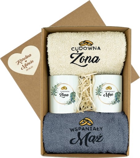 Oferujemy piękny i oryginalny prezent na ślub, rocznicę ślubu, czy jubileusz. Wysokiej jakości elegancki komplet ręczników z haftem oraz kubkami z pięknym nadrukiem umieszczonych w kraftowym eleganckim karbowanym pudełku wraz z ozdobnym grawerowanym sercem na froncie pudełka. Doskonały dodatek do koperty lub podarunek zamiast kwiatów, który zrobi wrażenie na Twoich najbliższych. Podaruj Młodej Parze niezapomniany prezent, który będzie przypominał im o ich wyjątkowej miłości i wspólnie spędzanych chwilach. Z pewnością jest to praktyczna i znakomita pamiątka na długie lata. ❤️