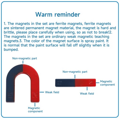 Zestaw zawiera 2 magnesy sztabkowe, 1 magnes w kształcie litery U, 1 wózek magnetyczny, 6 małych magnesów pierścieniowych, 1 stojak, 1 kompas, 1 proszek magnetyczny, 4 gumowe pierścienie, 1 podstawę, trójkątną przegrodę, naparstek, stojak, 2 motyle, 6 spinaczy i lista eksperymentów. Wszystkie te przedmioty są starannie zapakowane w solidne pudełko do przechowywania, dzięki czemu dzieci mogą je wygodnie wyjąć i bawić się z przyjaciółmi.
