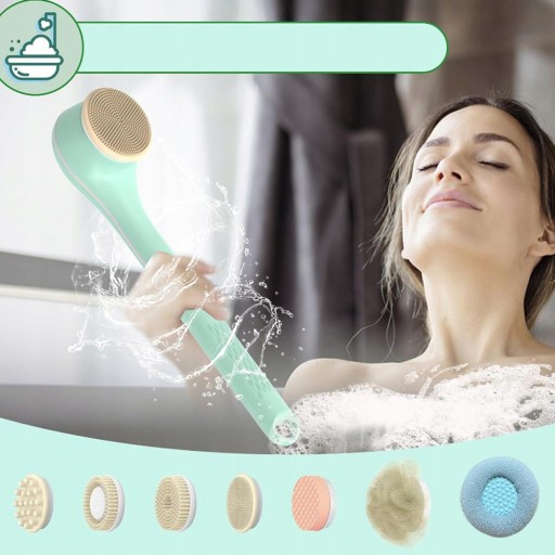 Aby zaspokoić różne potrzeby związane z czyszczeniem, elektryczna szczoteczka do kąpieli jest wyposażona w 6 różnych funkcjonalnych główek szczoteczki. Silikonowa szczoteczka do oczyszczania twarzy, szczoteczka do kąpieli z luffy wytwarzająca gęste bąbelki nawilżające skórę, szczoteczka z miękkim włosiem do codziennego oczyszczania, szczoteczka z gąbki do głębokiego oczyszczania, szczoteczka do peelingu stóp usuwająca martwe komórki naskórka, komfortowa szczoteczka do masażu zapewniająca komfortowe domowe spa, relaksujące ciało i delikatną skórę.