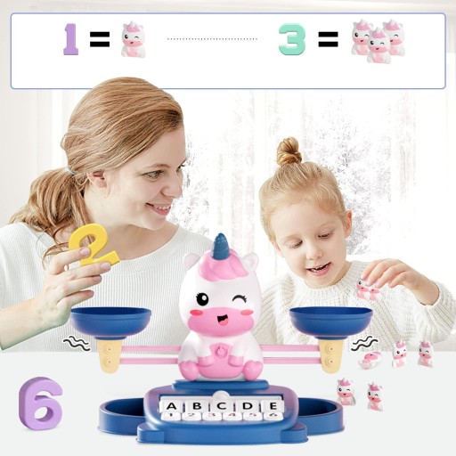 Dzieci mogą bawić się same, współpracować z przyjaciółmi lub wchodzić w interakcję rodzic-dziecko. Ojciec po jednej stronie podaje odważnik w kształcie cyfry, a po drugiej stronie prosi dzieci o podanie odpowiedniej liczby odważników w kształcie jednorożca, tak aby można było osiągnąć równowagę. Więcej sposobów zabawy czeka, aż dzieci dorosną.