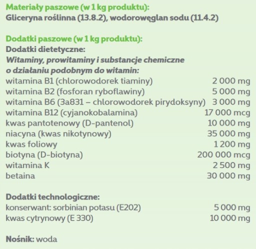 SUPLEXAN B COMPLEX to preparat zawierający kompleks witamin z grupy B oraz betainę. Produkt jest polecany w żywieniu drobiu w celu poprawienia wchłaniania aminokwasów i zwiększenia mięsności tuszki, a także po antybiotykoterapii i w trakcie stosowania w żywieniu substancji wiążących mikotoksyny. Niezastąpiony w łagodzeniu objawów nerwowych wynikających z niedoboru tiaminy.
