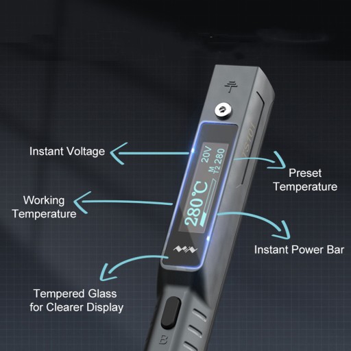 Przenośna cyfrowa lutownica kolbowa o mocy 65 W z wbudowanym wyświetlaczem OLED. Ma regulowaną temperaturę pracy w zakresie od od 50°C do 400°C ze skokiem 1°C. Posiada wiele wbudowanych funkcji, jak automatyczne usypianie, wyłączanie i inteligentny system kompensacji, które zapewniają dobrą kontrolę temperatury i intuicyjną pracę urządzenia. Użytkownik ma możliwość zdefiniowania 3 najczęściej używanych temperatur oraz zaimplementowany tryb Boost, który po aktywowaniu przyciskiem chwilowo zwiększa temperaturę lutowania. System dynamicznego wykrywania obwodów zapewnia bezpieczeństwo i chroni układy przed uszkodzeniem.